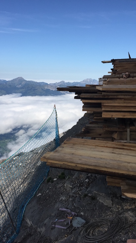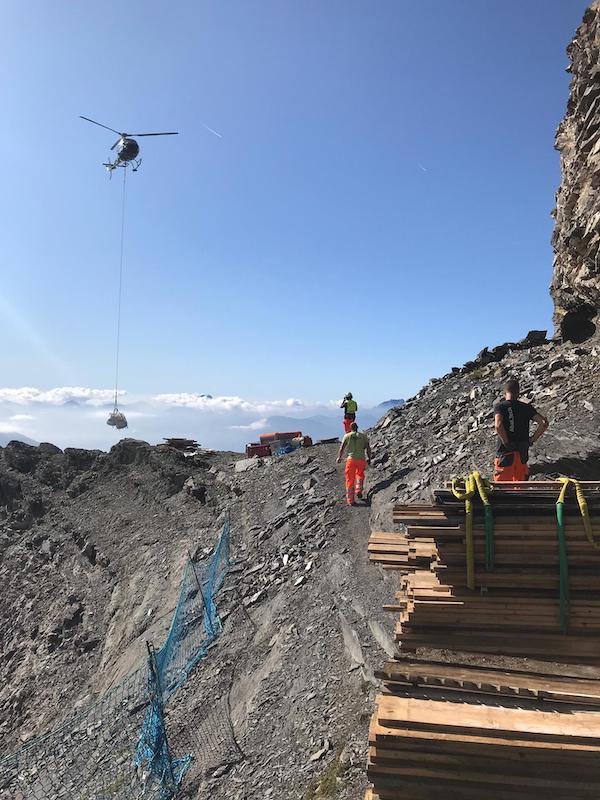 Notre équipe c'est occupé du démontage des ouvrages et de l'évacuation de celles-ci en collaboration avec l'entreprise d'hélicoptères Heli-Alps de Sion. Principalement contruites en bois, des charges de poutres, de planches et de différents matériaux ont soigneusement été préparés pour l'héliportage de ceux-ci jusque dans des bennes de tri.